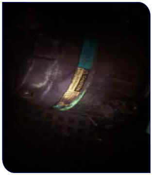 Hier ziet u twee foto´s van een V5 GM compressor waar men met kleurstof (die toegediend is aan het systeem) en een speciale lamp met bril de lekkage kan zien.